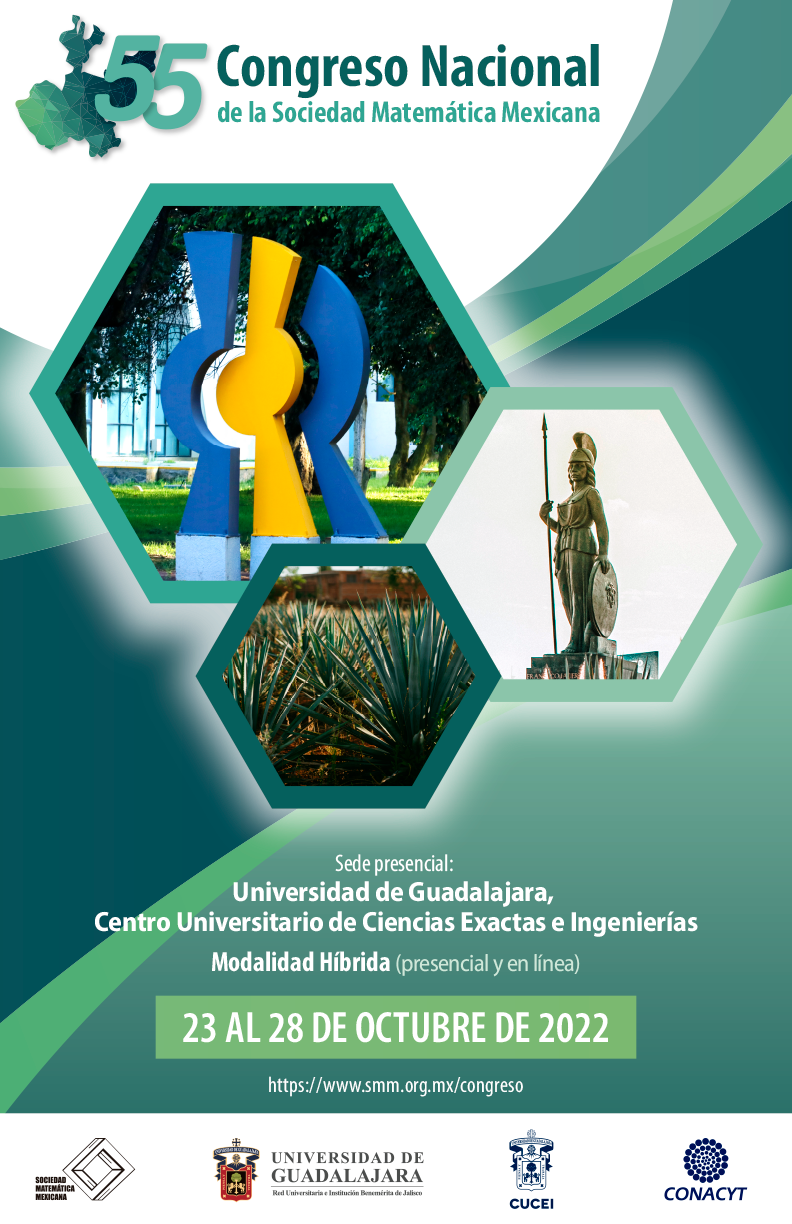 Nos complace informar a la comunidad matemática que el 55 Congreso Nacional de la Sociedad Matemática Mexicana se llevará a cabo del 23 al 28 de octubre de 2022, teniendo como sede el Centro Universitario de Ciencias Exactas e Ingenierías (CUCEI) de la Universidad de Guadalajara.