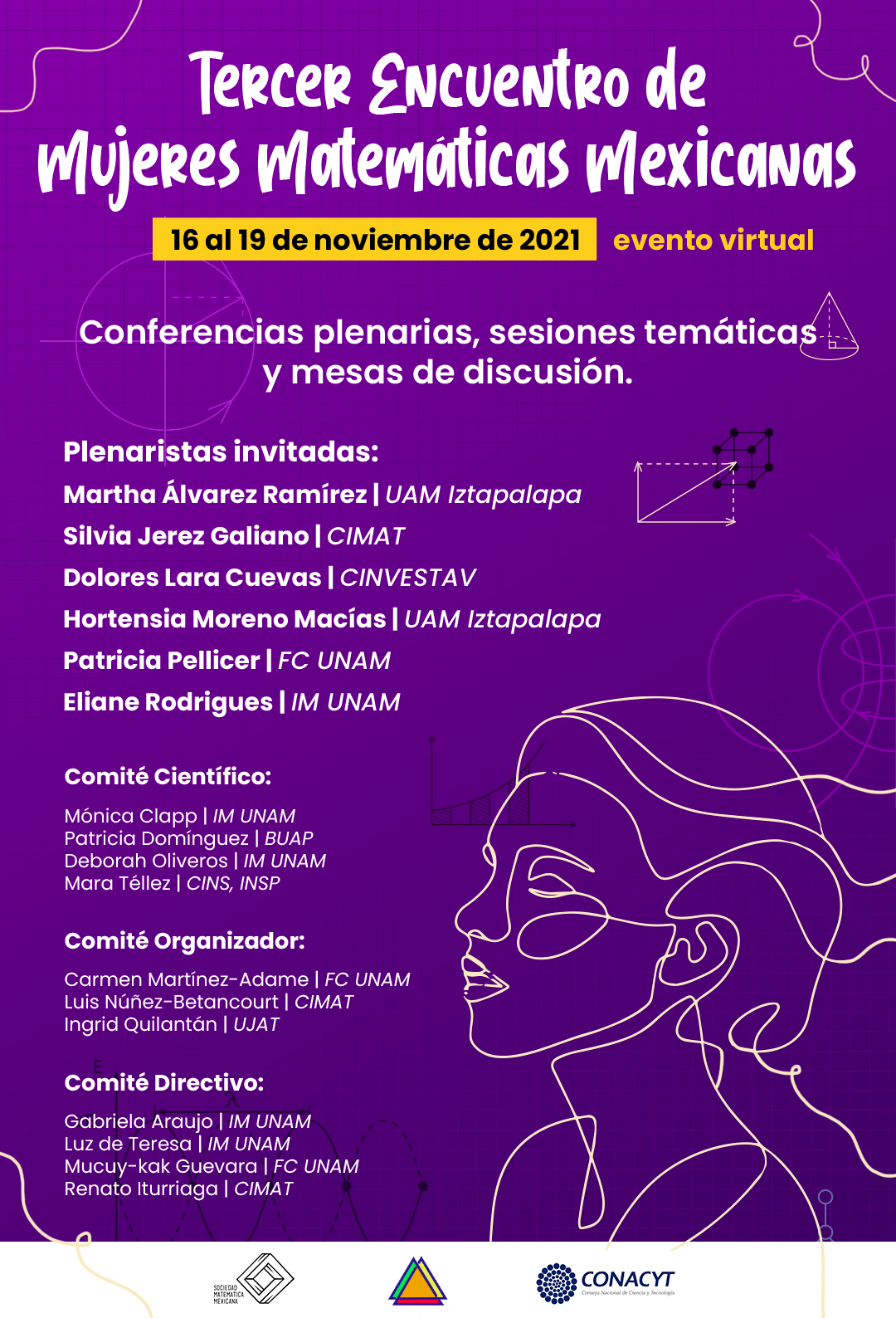 Nos complace anunciar que el Tercer Encuentro de Mujeres Matemáticas Mexicanas se llevará a cabo del 16 al 19 de noviembre de 2021. En esta tercera edición deseamos que el encuentro reúna a toda la comunidad matemática mexicana entorno al trabajo e investigación de mujeres matemáticas mexicanas, tanto investigadoras como estudiantes, con la finalidad de crear un punto de intercambio y de diálogo en la comunidad.