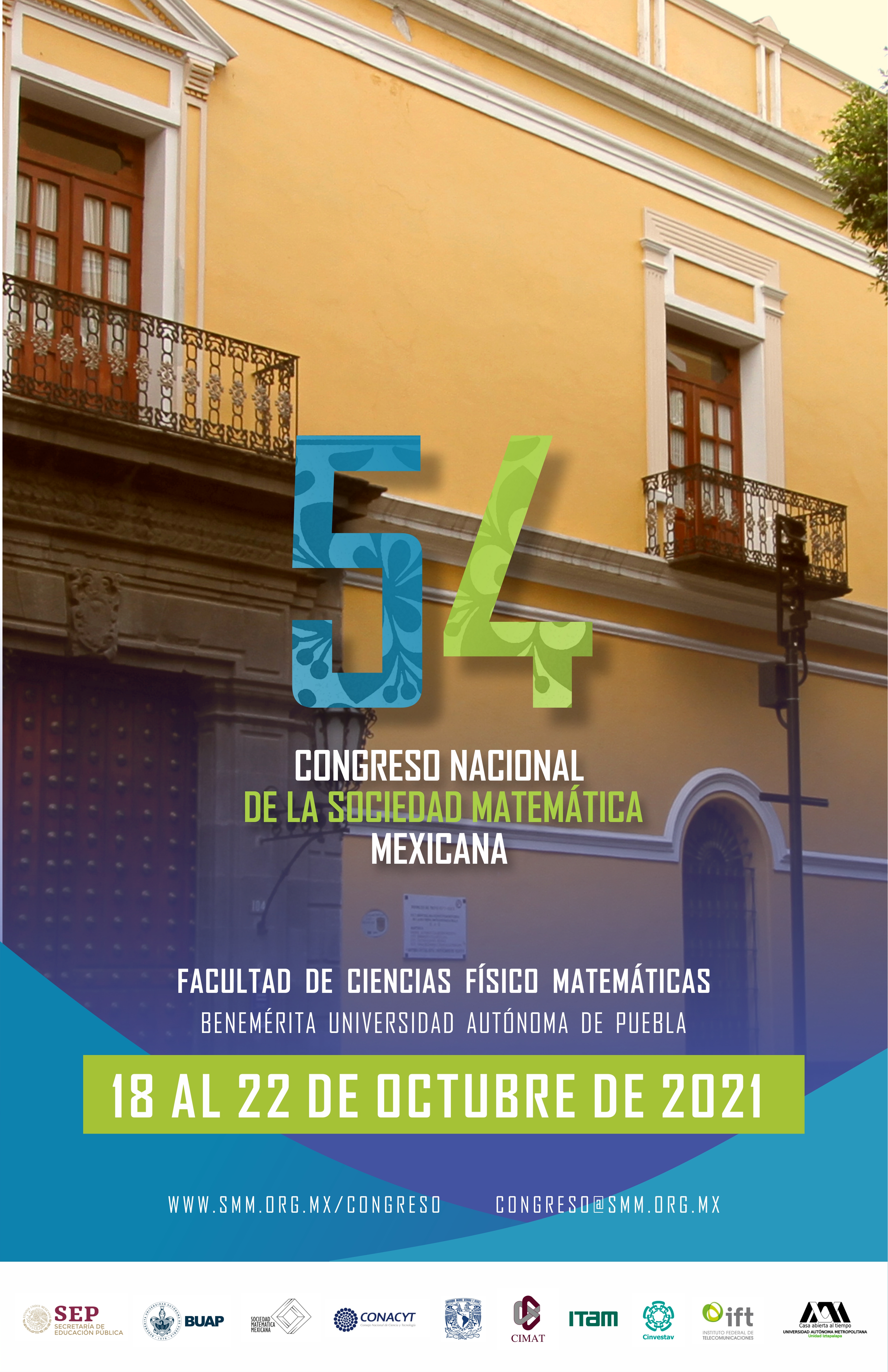 Nos complace informar a la comunidad matemática mexicana que el 54 Congreso Nacional de la Sociedad Matemática Mexicana se llevará a cabo del 18 al 22 de octubre de 2021, de manera virtual, teniendo como sede a la Benemérita Universidad Autónoma de Puebla.